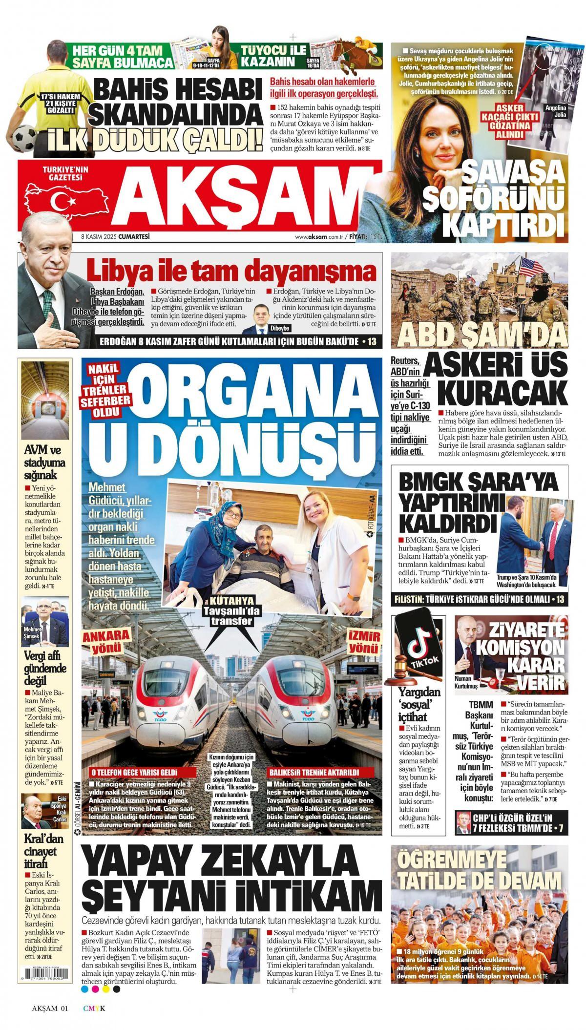 Akşam Gazetesi 8 Kasım 2025 Günü Manşeti