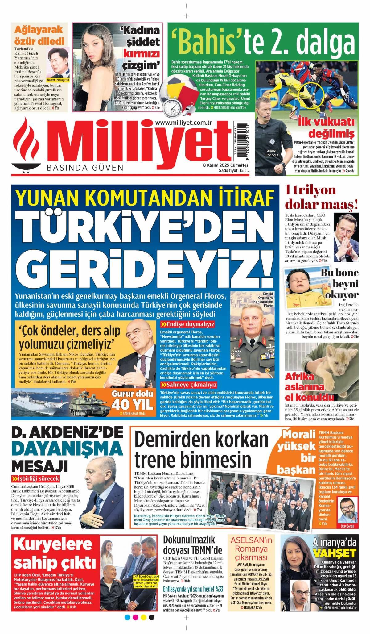 Milliyet Gazetesi 8 Kasım 2025 Günü Manşeti
